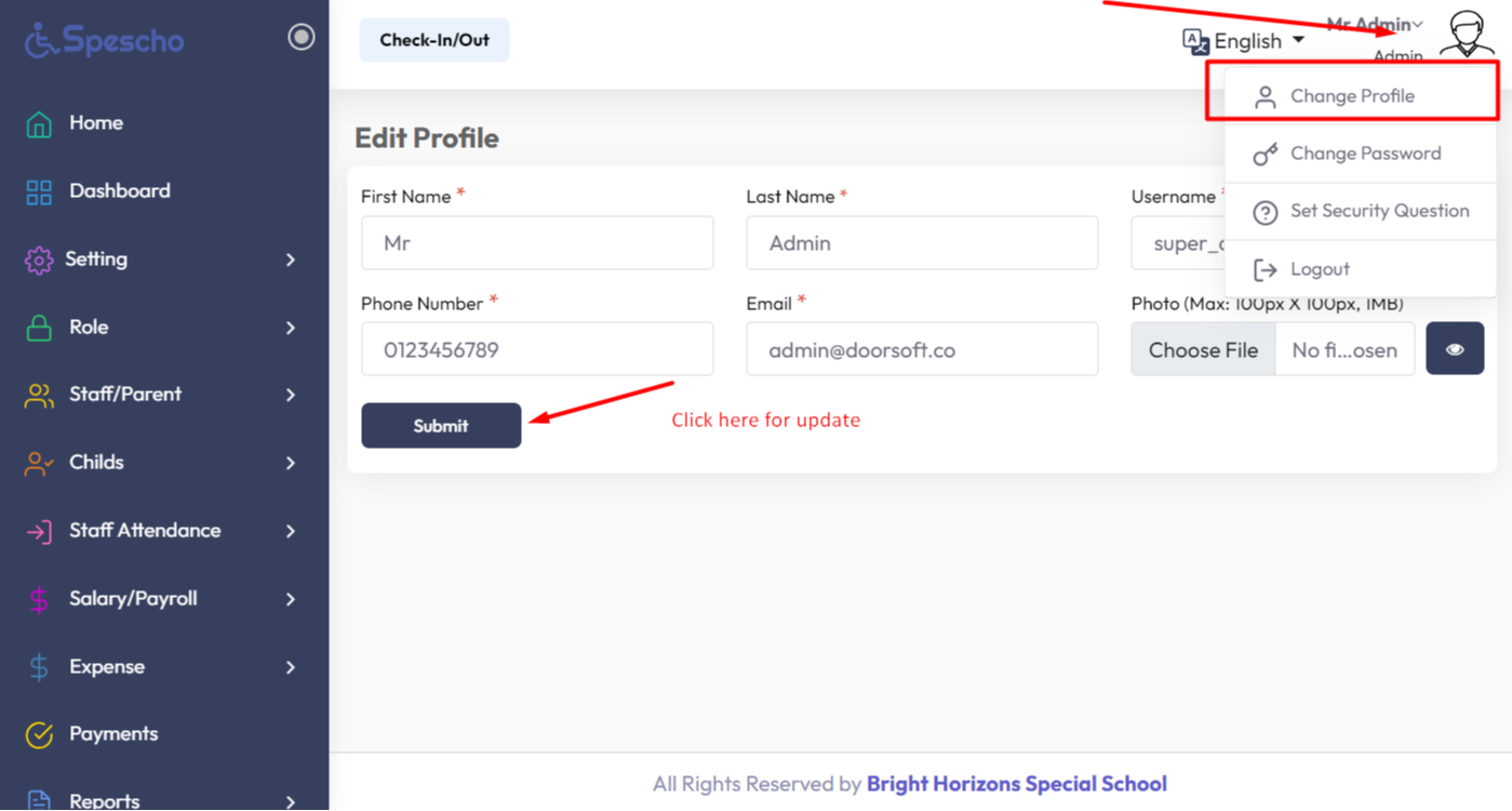 Go to the User profile section from the right top bar and click on “Change Profile”.